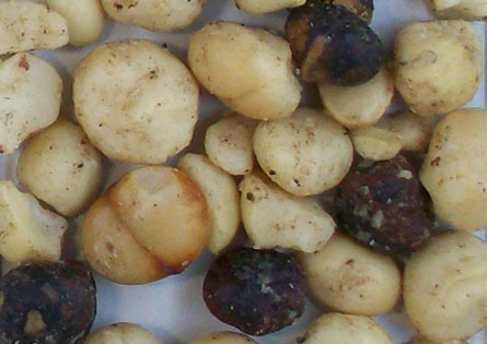 Nuestra maquinaria elimina los clasicos defectos de las nueces de macadamia, como los trozos de cascara, las nueces con piel, descoloridas, podridas y las nueces dañazas por insectos..